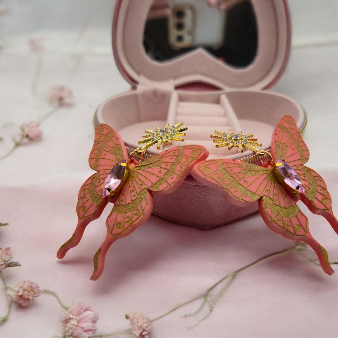 A butterfly with pink and gold wings dances in the moonlight, carrying magic and freedom. A small guardian of dreams that shines with delicacy and mystery.