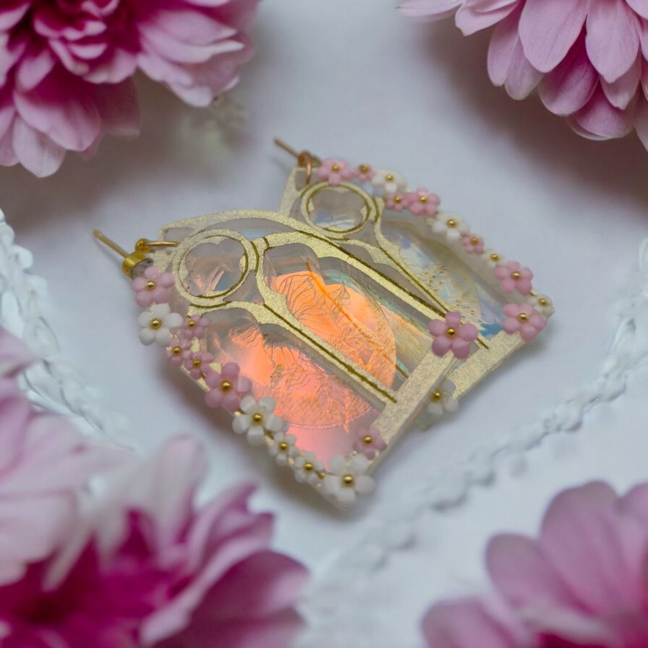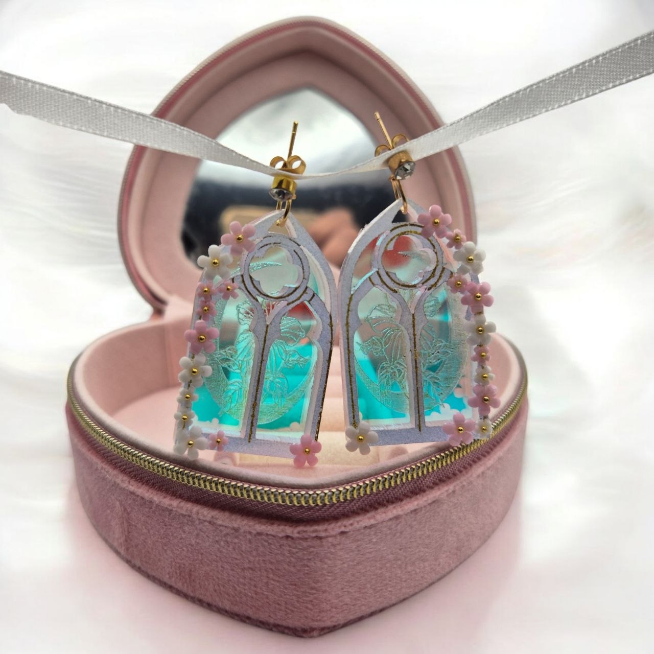Earrings inspired by Gothic stained glass, with a delicate iridescent glow and white and pink flowers that capture the light like celestial petals.