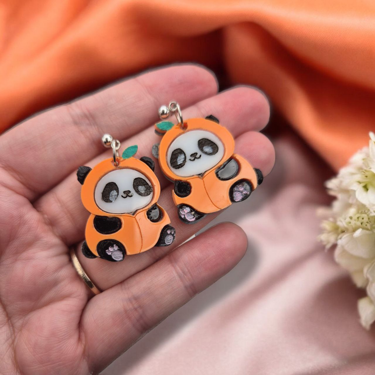 Pechi es un pendiente con forma de panda disfrazado de melocotón, donde las líneas suaves y el color aterciopelado se combinan en una pieza equilibrada y expresiva.