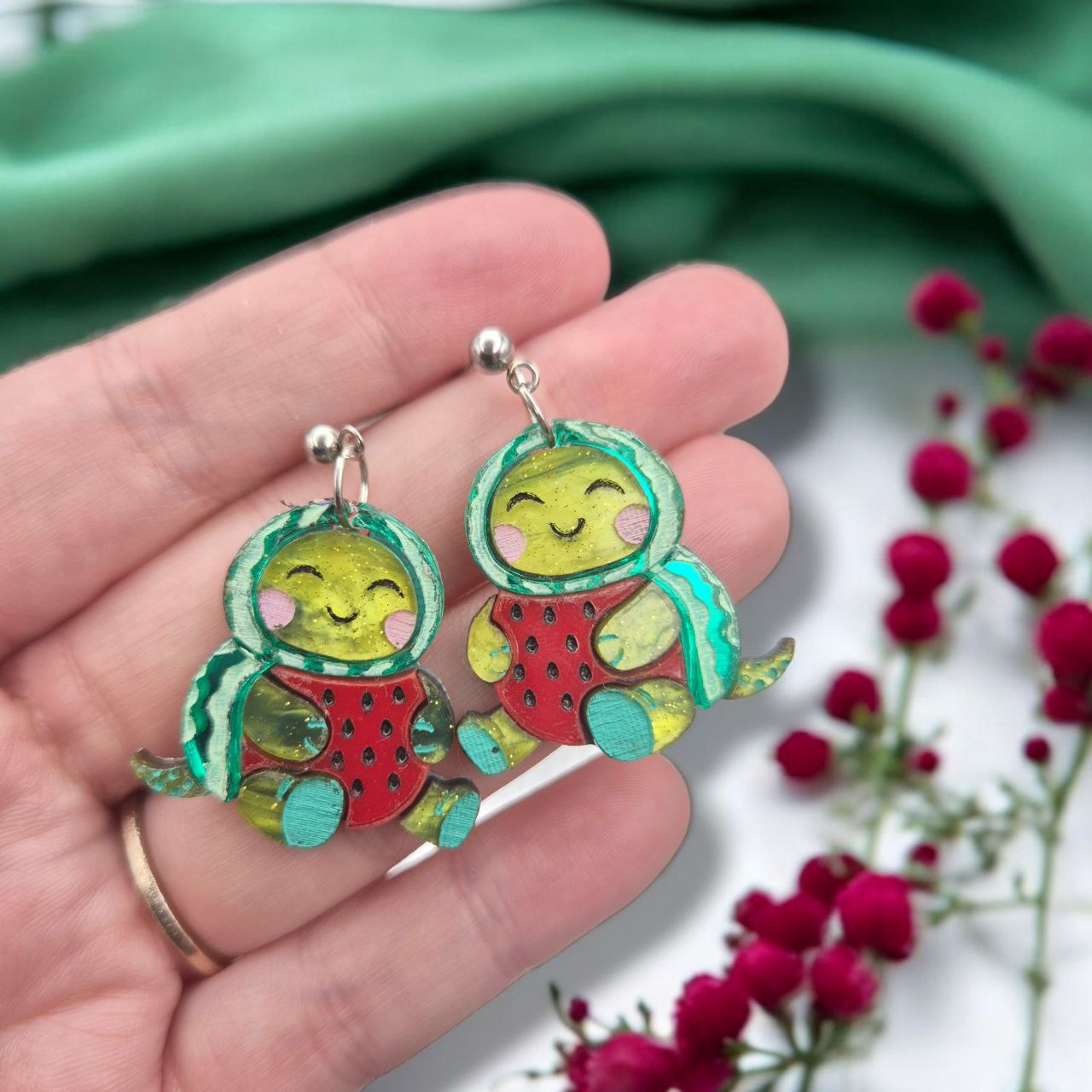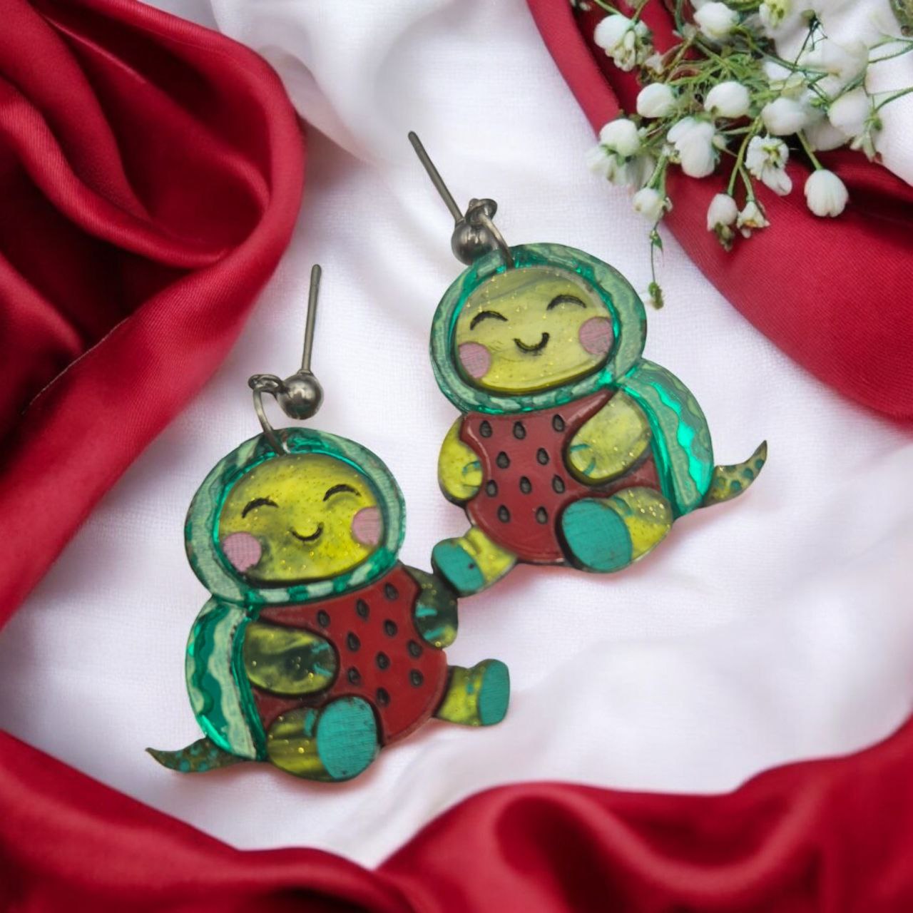 Watami es un pendiente con forma de tortuga disfrazada de sandía, donde la geometría del fruto y la silueta pausada se combinan en una pieza equilibrada y expresiva.
