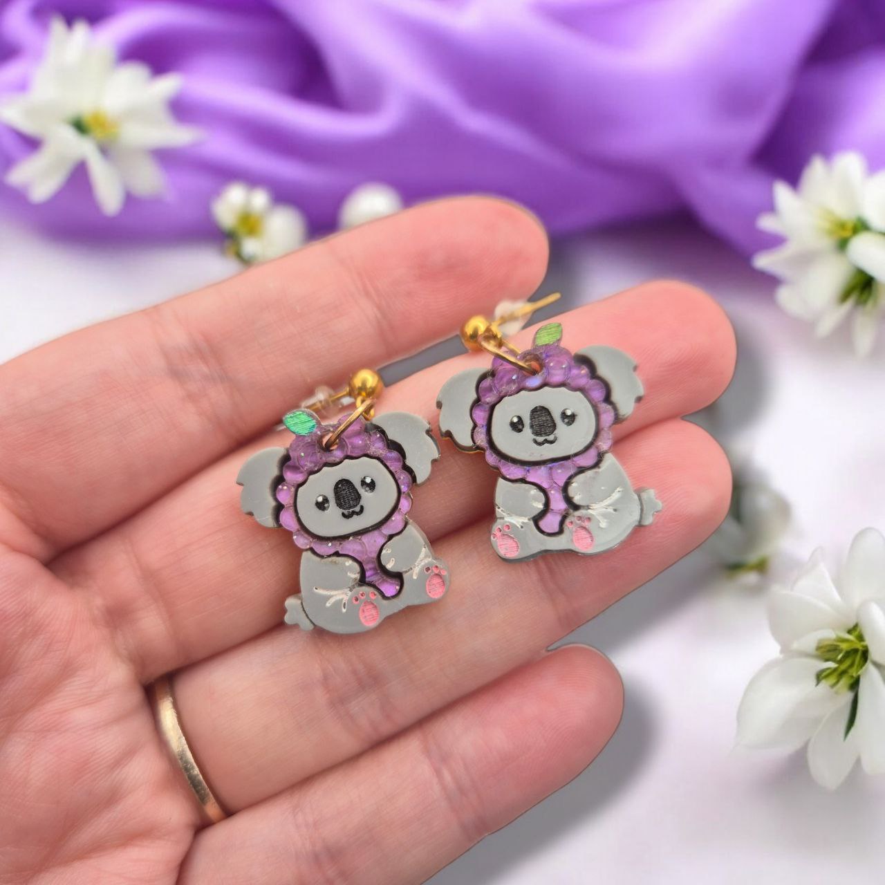Grapy es un pendiente con forma de koala disfrazado de uvas, donde los volúmenes redondeados y el color profundo crean una pieza suave y equilibrada.