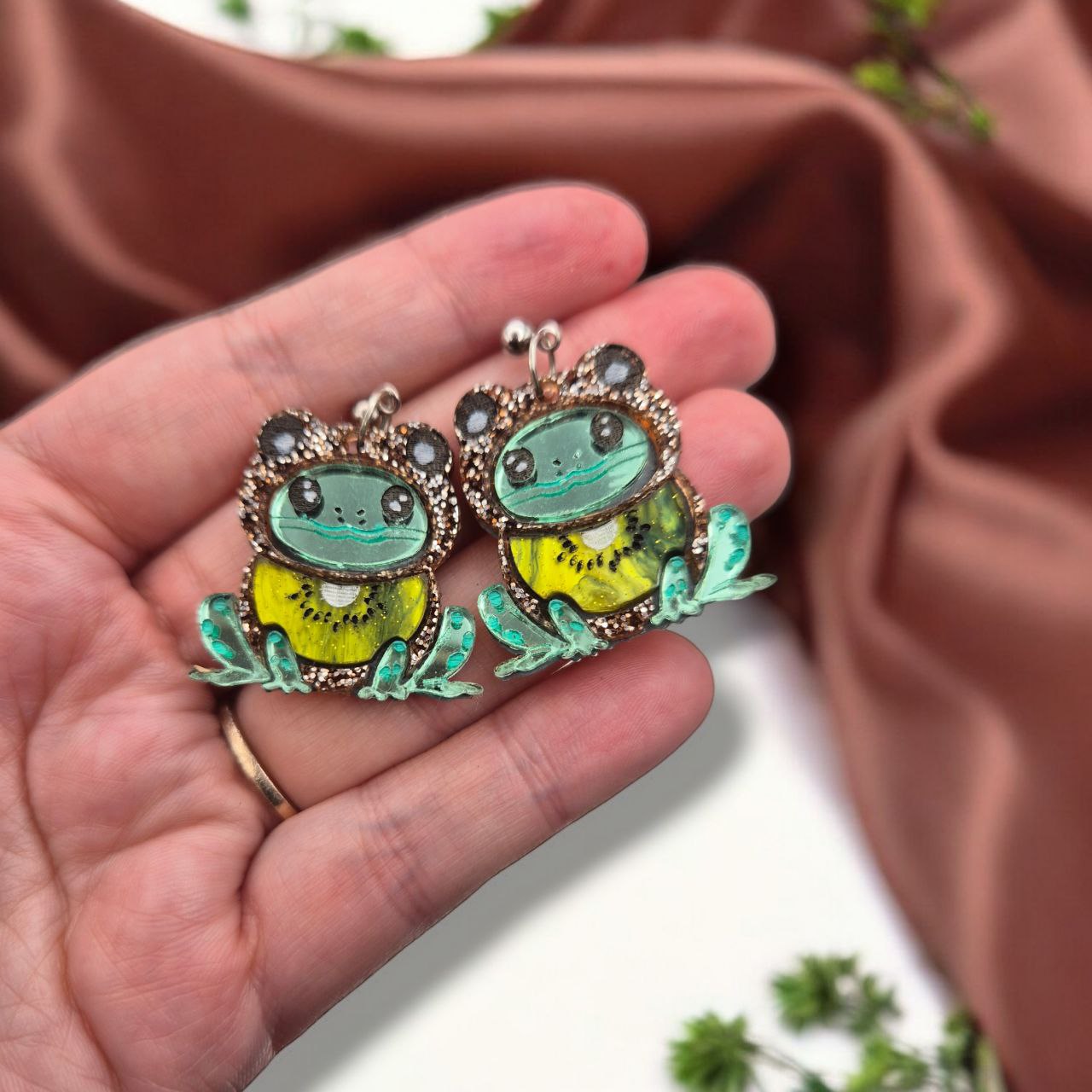 Kiwana es un pendiente con forma de rana disfrazada de kiwi, donde la silueta ágil y el patrón del fruto se combinan en una pieza fresca y equilibrada.