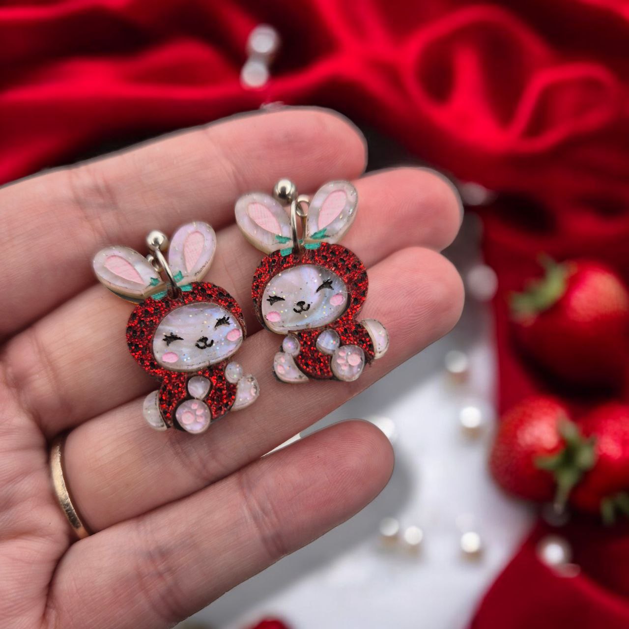 Strawbunny es un pendiente en forma de conejo disfrazado de fresa, donde lo animal y lo vegetal se encuentran en una pieza ligera y expresiva.